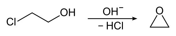 원래는 EO(에틸렌옥사이드)를 만드는 원료로 2-chloroethanol을 사용한다. (2-chloroethanol에 KOH를 반응시키는 공정, 아래 식에는 HCl이 적혀 있지만, KCl이 빠지도록 하는 공정이 조금 더 경제적이다.)