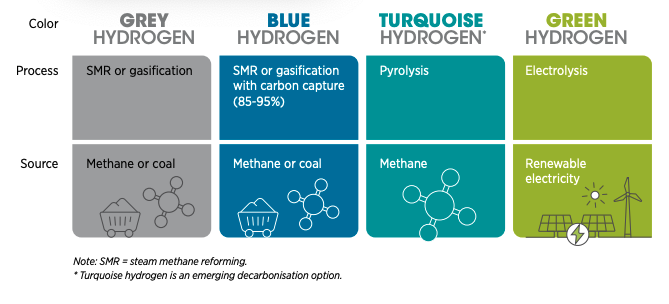 그린 수소 (Green hydrogen) - 전기 분해 공정을 이용하되, 신재생에너지 발전을 이용하여 제조한 수소.