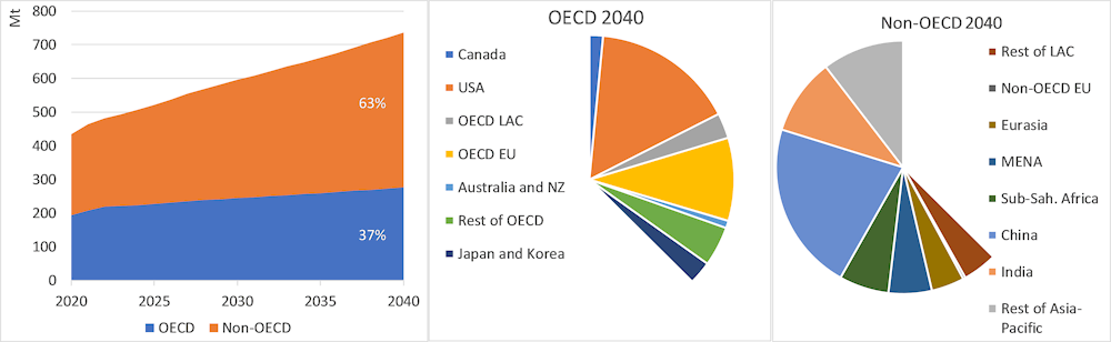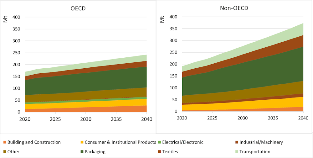 기준 시나리오에 따르면 전기/전자 및 운송 분야에서 2020년과 2040년 사이에 플라스틱 사용이 가장 빠르게 증가할 것으로 나타났습니다( 그림 2.3 ). 전기/전자 분야는 다른 일부 분야에 비해 상대적 으로 규모가 작지만 많은 폴리머와 관련이 있으며 2020년 9Mt에서 2040년 21Mt으로 비OECD 국가에서 증가할 것으로 예상되어 강력한 산업 성장을 반영합니다. OECD 국가에서는 이 분야에 대한 플라스틱 사용 증가가 제한되어 2020년 7Mt에서 2040년 9Mt으로 증가합니다. 운송 분야의 플라스틱 사용 증가도 강력한데, 이 경우 사용이 다른 분야보다 빠르게 성장하는 신흥 경제와 개발도상국에 더 집중되어 있기 때문입니다. 2040년 운송 분야의 플라스틱 사용은 OECD 국가에서 30% 미만으로 예상됩니다.