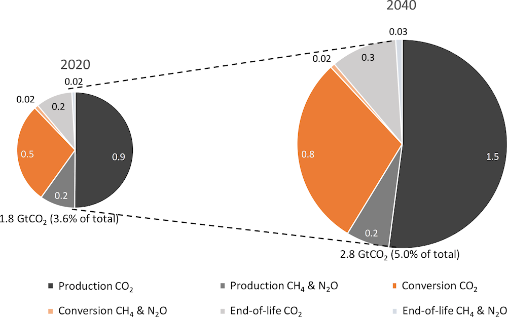 플라스틱 수명 주기는 앞으로 수십 년 동안 온실 가스(GHG) 배출의 증가하는 원천이 될 것으로 예상됩니다. 기준 시나리오에서 플라스틱 수명 주기의 GHG 배출량은 2020년 수준(1.8 GtCO 2 e)에 비해 2040년에 60% 증가할 것입니다. 이는 2021년 현재 시행 중인 정책의 영향에도 불구하고 이미 GHG 배출량 증가를 제한할 것입니다. 플라스틱 수명 주기의 배출량은 2020년에 전 세계 총 배출량의 3.6%를 차지했으며, 이 비율은 2040년까지 5.0%로 증가할 것으로 예상됩니다. 이는 파리 협정과 일치하지 않는 결과입니다. 증가하는 비율은 플라스틱과 관련된 배출량의 지속적인 증가 속도와 기후 정책 공약으로 인한 전반적인 배출량의 느린 증가 속도가 결합된 것을 반영합니다.