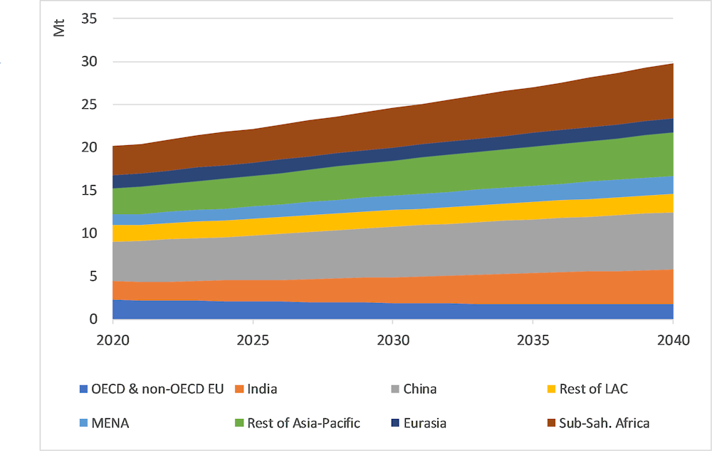 주로 건설에 사용되는 폴리염화비닐(PVC)은 2020년에서 2040년 사이에 60% 미만의 증가율을 기록하며 가장 느리게 성장하는 폴리머입니다. 그럼에도 불구하고, 건설 분야에서만 2020년에서 2040년 사이에 15Mt의 절대 증가율을 기록하는 상당한 범주입니다( 그림 2.3 의 오른쪽 ). 반면, 직물에 사용되는 섬유와 타이어용 엘라스토머는 61Mt에서 109Mt으로 약 80% 증가할 것으로 예상됩니다. 폴리머와 응용 분야에 따른 이러한 추세의 차이는 지역별 부문별 경제 성장의 차이에 따른 결과이며, 플라스틱 사용이 특정 부문 및 국가의 특정 경제 활동과 연계되는 세부적인 접근 방식의 중요성을 강조합니다.