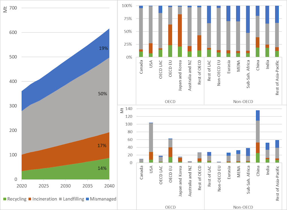 기준 시나리오 에서 국가는 모든 폐기물의 환경적으로 건전한 관리를 향해 나아가고 재활용을 강화하기 위해 폐기물 수거, 분류 및 처리를 지속적으로 개선할 것으로 예상됩니다. 그 결과, 세계는 2020년에 비해 2040년에 추가로 219Mt의 폐기물을 안전하게 관리할 수 있을 것으로 예상됩니다. 폐기물 분류 및 재활용 인프라가 개선되면 2040년에 폐기물의 14%가 재활용될 것입니다(2020년에는 9.5%, 그림 2.6 ). 그러나 플라스틱 폐기물 발생량이 증가함에 따라 매립이 계속해서 눈에 띄는 역할을 하게 될 것입니다(2020년 178Mt에서 2040년 305Mt으로 전체 폐기물의 절반이 수명이 다한 운명으로 안정적으로 유지됨). 반면 소각은 백분율로 약간 감소할 것입니다(2020년 19%에서 2040년 17%).