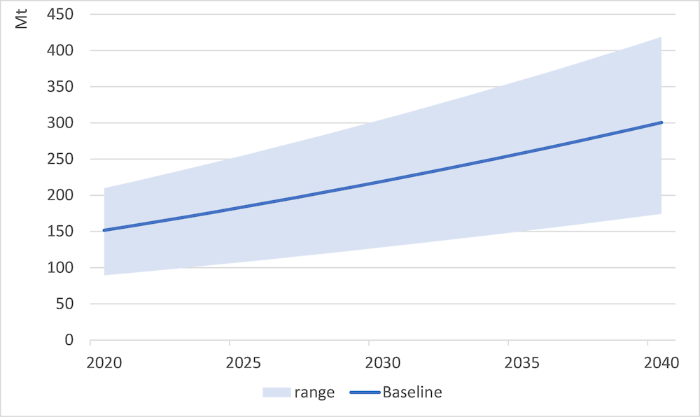 기준 시나리오 는 1차 플라스틱에서 벗어나는 것을 장려하기 위한 새로운 정책이 시행되지 않는다고 가정합니다. 이는 수요 증가(2020년에서 2040년 사이에 70% 증가)와 1차 생산에 맞춰 재활용이 예상대로 성장함에 따라 2차 플라스틱 생산이 증가하게 됩니다. 결과적으로 총 생산에서 2차 플라스틱의 점유율은 세계 평균 6%로 상당히 안정적으로 유지됩니다.