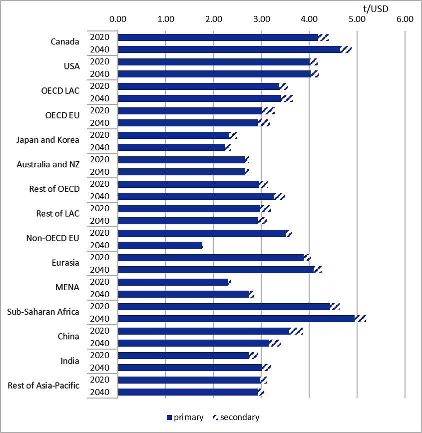 그림 2.2에 대한 링크 복사. 지역별 GDP 단위당 플라스틱 사용의 수렴은 매우 제한적입니다.2020년과 2040년 기준 시나리오 에서 GDP 단위당 톤 수(t/USD)로 나타낸 경제의 (1차 및 2차) 플라스틱 강도