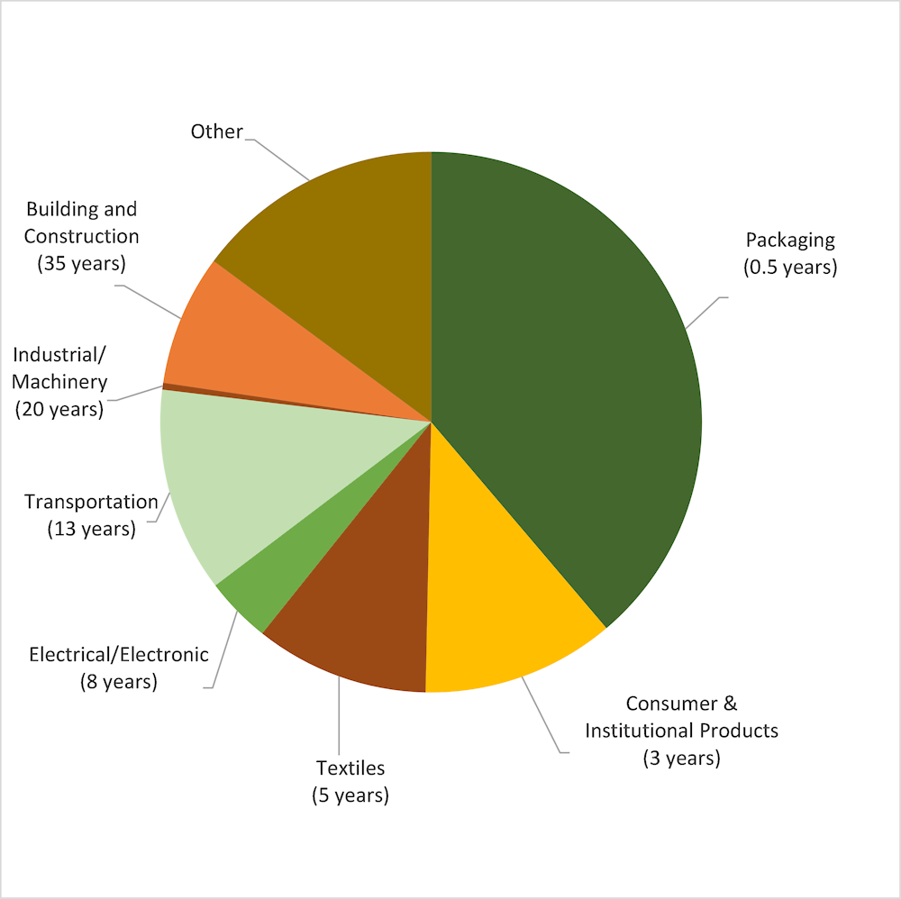 그림 2.4에 대한 링크 복사. 단기 응용 프로그램은 플라스틱 폐기물 생성의 주요 원인입니다.2040년 총 플라스틱 폐기물(및 상대적 평균 수명) 중 다양한 응용 분야의 점유율