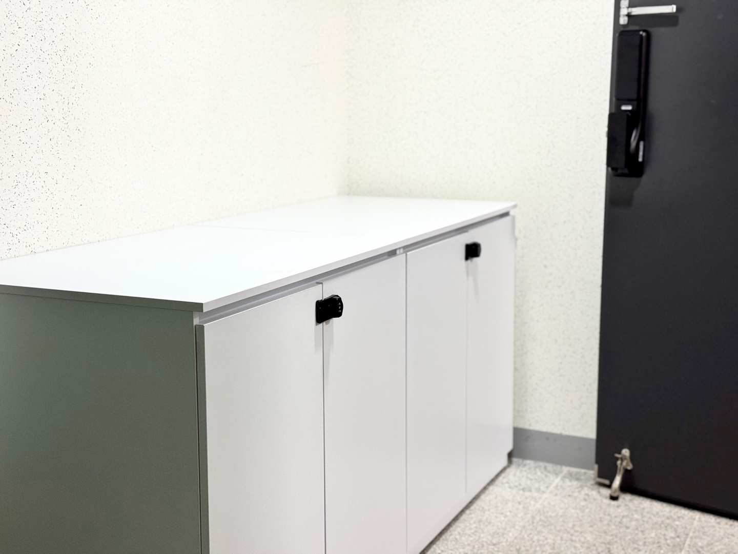 현관 열림을 방해하지 않으면서, 수납은 가능하고, 디자인은 정갈하며, 단순하지만 확실한 잠금장치를 설치한 모습.