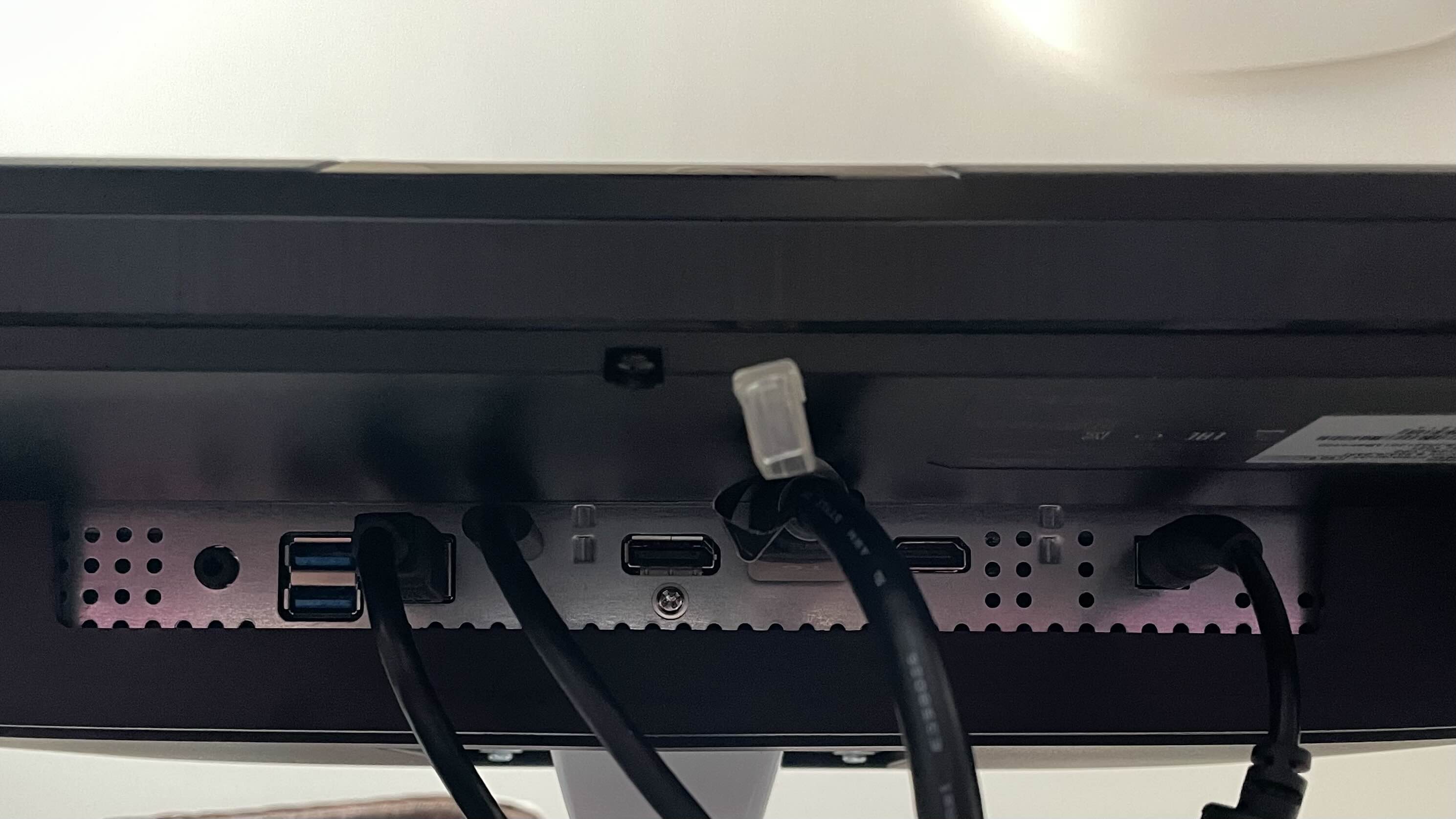 왼쪽부터 오디오(3.5mm) USB 3.0 다운스트림2개, USB 3.1 업스트림 하나, USB-C(DP-ALT), DisplayPort, HDMI 2.1 두 개, 전원 순서.