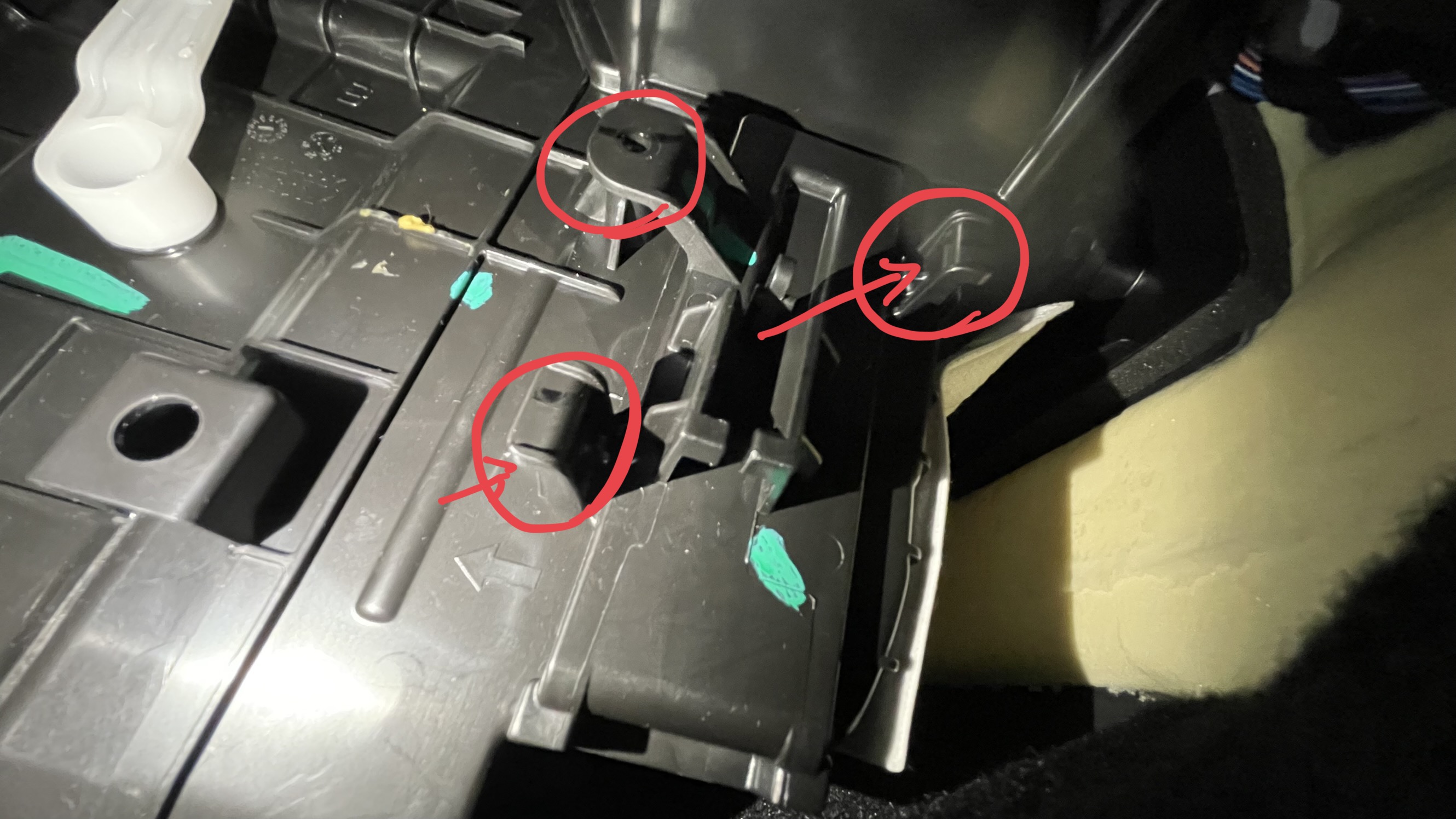 나사를 빼고 나면, 나머지 두 동그라미 위치의 플라스틱을 일자 드라이버로 살짝 제쳐 줘야 한다. 잘 보이지는 않지만, 저기에 플라스틱끼리 걸려 있어서 빼기 어렵다.